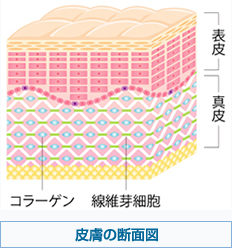 真皮層は、線維や毛細血管、リンパ管などがあり、これらが表皮層を支えています。酸素や栄養素を送ることや、老廃物を運び去っています。主な成分として膠原線維(コラーゲン)と弾性線維(エラスチン)、これらの間を埋めるゼリー状のもの(ヒアルロン酸が代表的)です。これらは「線維芽細胞」という細胞から分泌され、皮膚の弾力やハリは、このコラーゲンやエラスチンによって人それぞれ異なります。